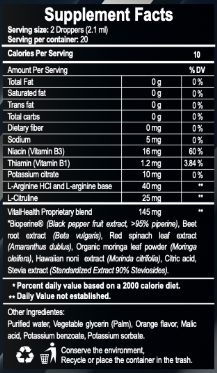 Water, L-Arginine, L-Citrulline, Natural Orange Flavor, Glycerin, Niacinamide (Vitamin B3), Potassium, Black Pepper extract (Piper nigrum) with 95% Piperine, Beetroot extract (Beta vulgaris), Noni extract (Morinda citrifolia), Moringa extract (Moringa oleifera), Red Spinach extract (Amaranthus spp.), Citric Acid, Potassium Sorbate, Potassium Benzoate, Sucralose, and Stevia as sweeteners.